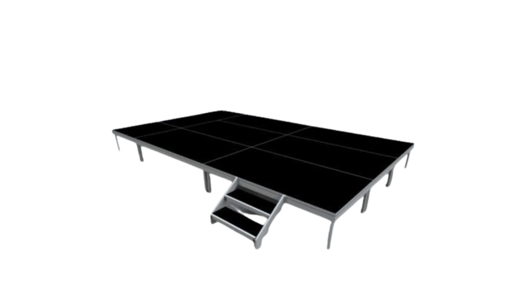 Disponemos de escenarios modulares que permiten adaptarse a diferentes tamaños y configuraciones. Esto permite crear estructuras personalizadas según el tipo de evento.